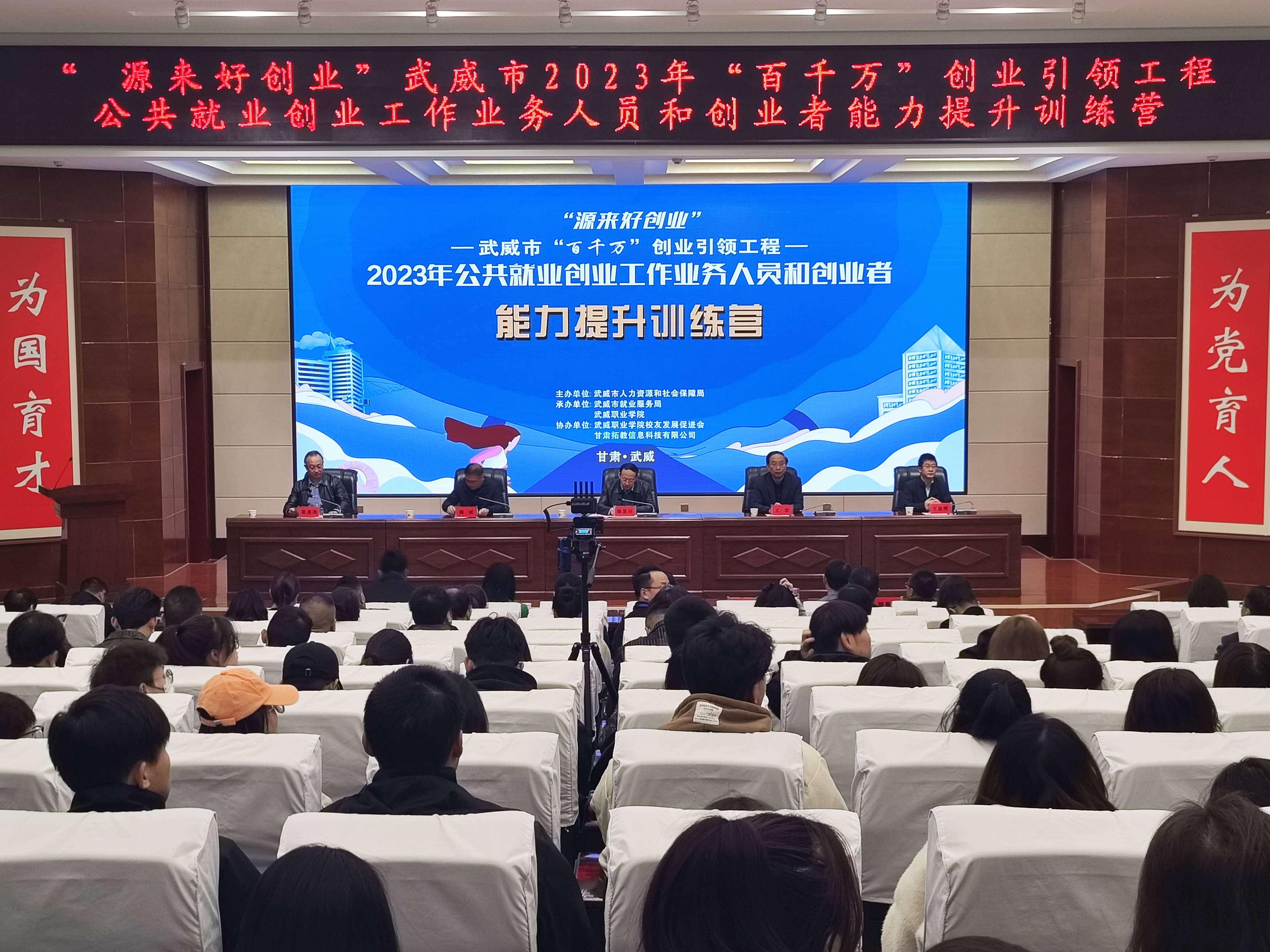 10月24日-26日,由武威市人社局主辦,我校承辦的武威市2023年“百千萬”創(chuàng)業(yè)引領(lǐng)工程就業(yè)創(chuàng)業(yè)能力提升訓(xùn)練營在菁英廳成功舉辦,武威市人社局黨組書記,局長陳昱川,市人社局黨組成員,市就業(yè)局局長魏斌,學(xué)校黨委書記王宏出席了開營儀式。來自縣區(qū)就業(yè)創(chuàng)業(yè)指導(dǎo)中心負(fù)責(zé)人,分管就業(yè)創(chuàng)業(yè)工作的領(lǐng)導(dǎo),就業(yè)創(chuàng)業(yè)工作業(yè)務(wù)骨干,我校學(xué)生代表共200人參加訓(xùn)練營活動(dòng)。