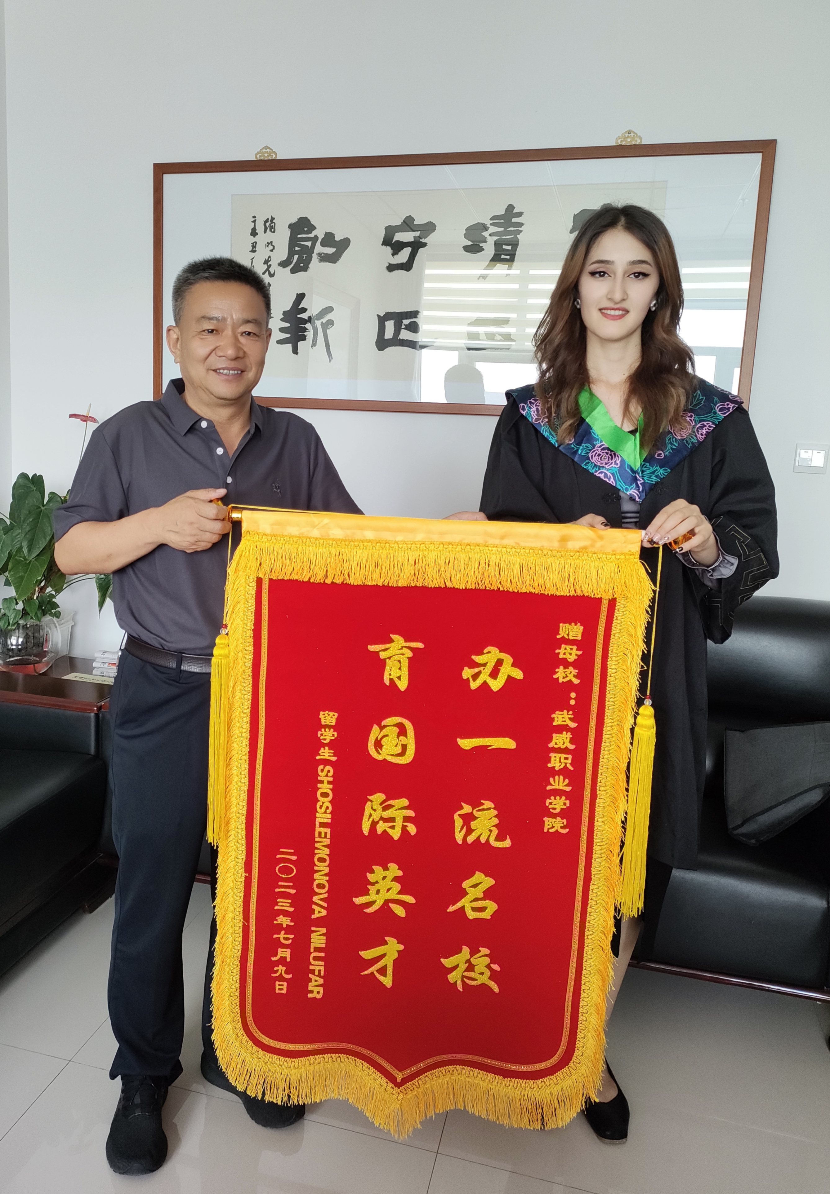國際學生HOSILEMONOVA NILUFAR(妮娜)向學校贈送“辦一流名校 育國際英才”的感謝旌旗,對學校精心、悉心培養(yǎng)自己表達了由衷的感謝,表示在武威職業(yè)學院收獲了專業(yè)技能和人生閱歷,接觸到了先進技術技能和前沿思想,特別是通過學習中國文化,深刻認識到文化交流的重要性,也更加堅定了自己繼續(xù)學習中文和中國文化的決心。