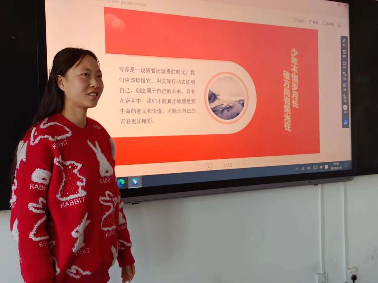 藝術(shù)與教育學(xué)院2021級學(xué)生后麗婷分享了自己參加“三下鄉(xiāng)”社會實踐服務(wù)團隊,走進基層社區(qū)開展志愿服務(wù)活動,在基層體悟中不斷增強責(zé)任感和使命感,在社會課堂中“受教育、長才干、作貢獻”的事跡。她期盼各位學(xué)子做新時代好青年,如螢火一般,有一分熱便發(fā)一分光,以奮斗來點亮青春最亮麗的底色。