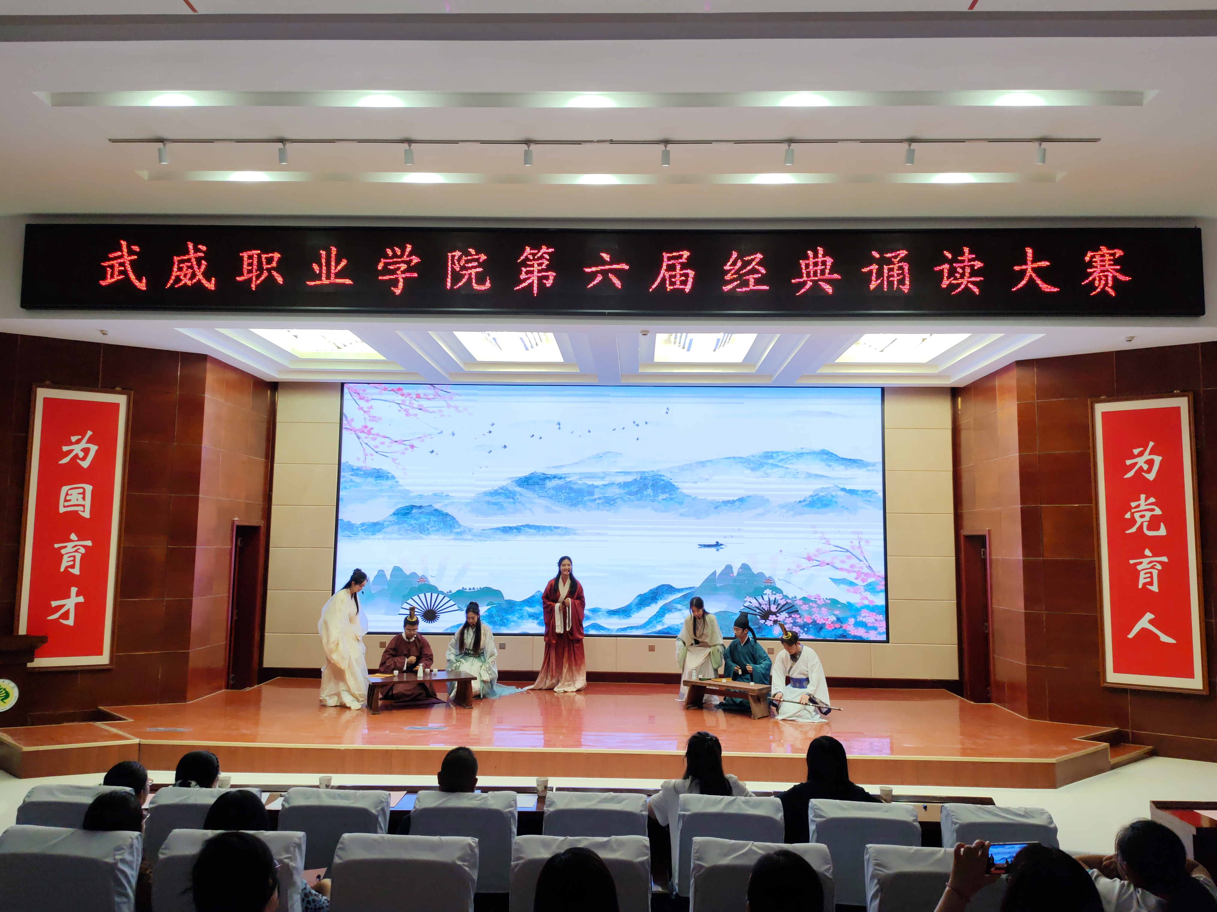 為深化全民閱讀活動(dòng)開展,引領(lǐng)社會(huì)大眾親近中華經(jīng)典,傳承弘揚(yáng)中華優(yōu)秀文化,齊心共書強(qiáng)國新篇章,武威職業(yè)學(xué)院第六屆經(jīng)典誦讀大賽于6月4日在菁英廳成功舉辦。黨委委員、副校長(zhǎng)田迎春,科研處處長(zhǎng)蔡柱山出席比賽現(xiàn)場(chǎng),邀請(qǐng)語言文字專業(yè)5位評(píng)委為教師組、學(xué)生組、留學(xué)生組共20件參賽作品進(jìn)行現(xiàn)場(chǎng)評(píng)分。