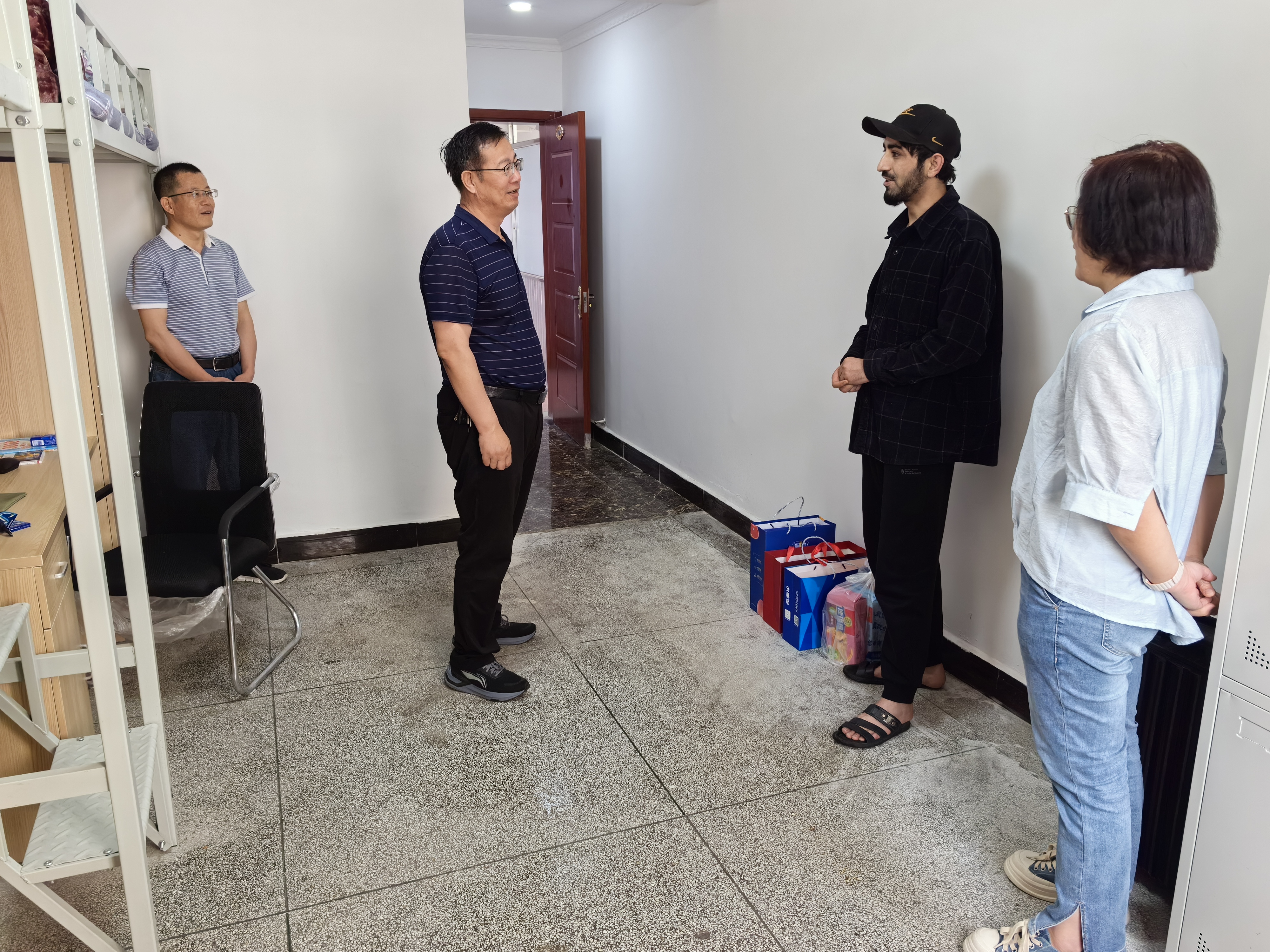 張開禮深入留學生宿舍、廚房,查看了解留學生住宿、生活情況,并代表學校黨委向留學生表達了節(jié)日的慰問和良好的祝愿,向留學生送上慰問品。在留學生公寓,張開禮與留學生親切交談,關切詢問留學生日常生活、專業(yè)學習、課程實訓、畢業(yè)就業(yè)等情況。他鼓勵留學生們努力學習,養(yǎng)成良好生活習慣,遵守公寓管理規(guī)則和安全條例,保持良好生活環(huán)境,同時也提醒留學生們端午節(jié)放假期間,不論是外出還是在校,都要注意安全,遵守法律法規(guī)和校紀校規(guī)。