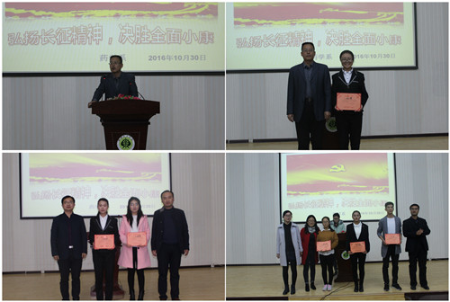 為紀(jì)念紅軍長征勝利80周年,激發(fā)師生弘揚(yáng)偉大的長征精神,同時(shí)為豐富校園文化生活,展示青春正能量,藥學(xué)系團(tuán)總支依據(jù)院團(tuán)委的通知精神和系團(tuán)學(xué)工作委員會(huì)關(guān)于增加學(xué)生課余活動(dòng)的會(huì)議要求,于10月30日在正德廳組織開展了“傳承長征精神,筑我青春夢想”主題演講比賽。藥學(xué)系主任魏潤明出席了本次活動(dòng),各班班主任擔(dān)任本次比賽評委,2016級全體學(xué)生和2015級各班學(xué)生代表觀看了比賽。