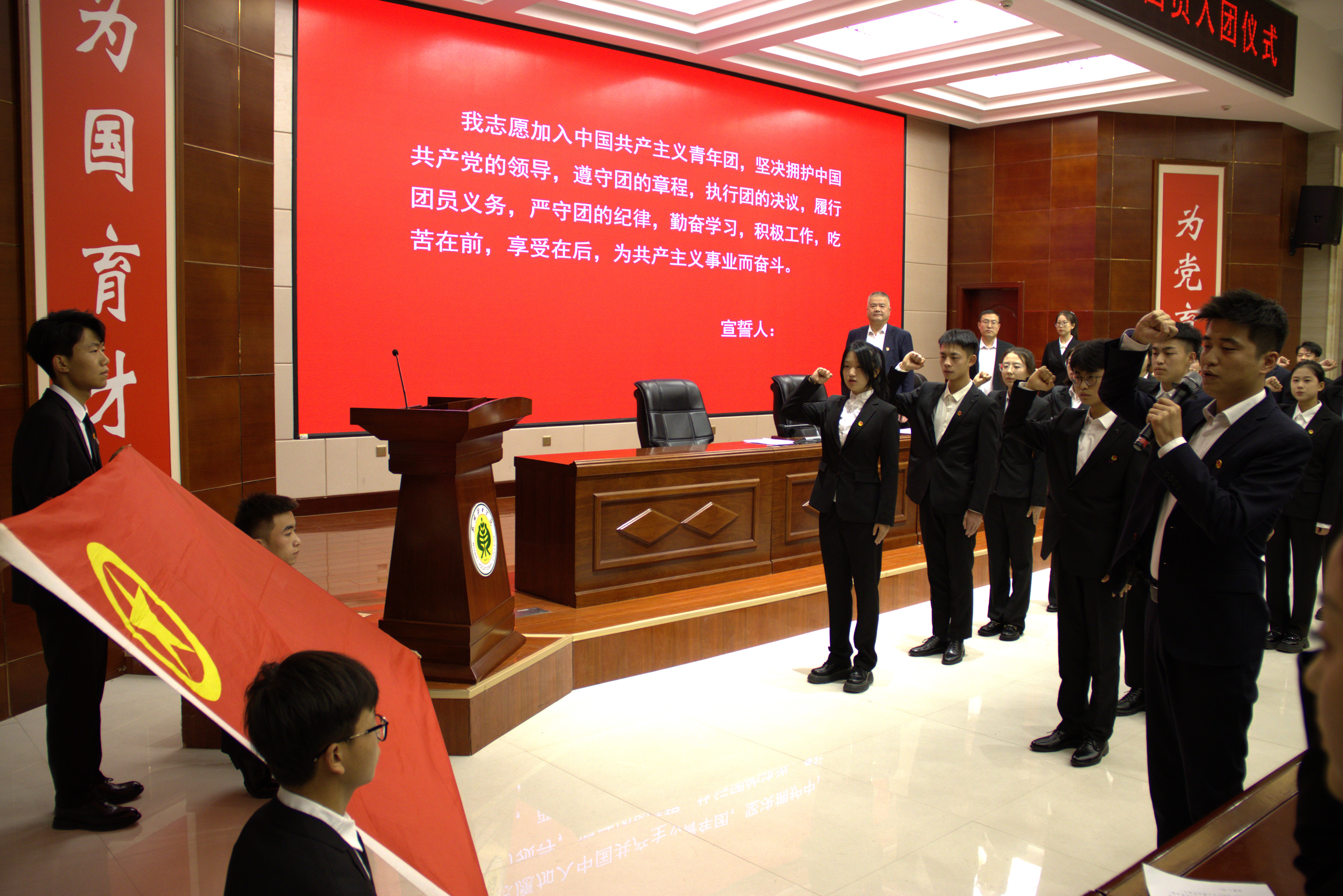 入團儀式上,宣讀了422名新團員名單,老團員為新團員代表佩戴團徽,全體新老團員面向團旗莊嚴宣誓。