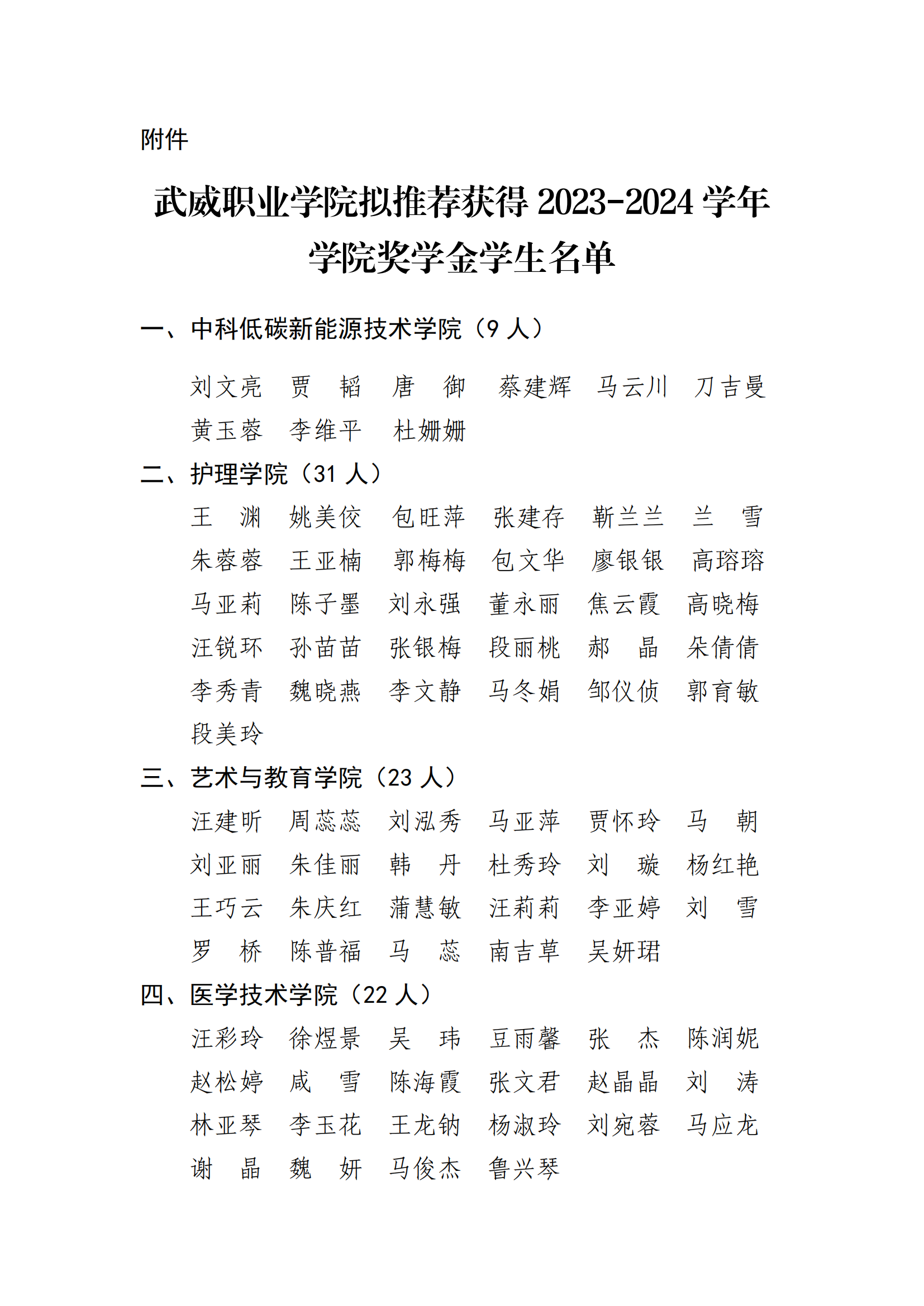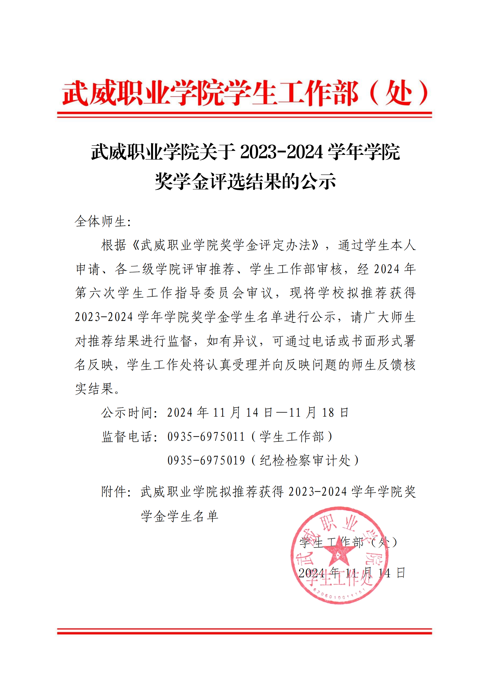 武威職業(yè)學院關(guān)于2023-2024學年學院獎學金評選結(jié)果的公示