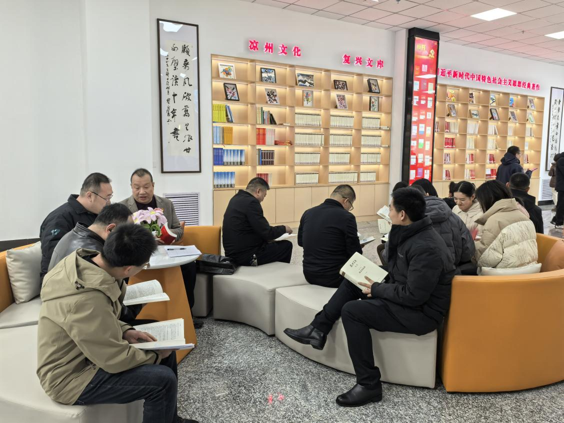 黨員們圍坐在書架旁,認真閱讀關(guān)于習近平新時代中國特色社會主義思想書籍。書籍涵蓋了黨的創(chuàng)新理論、實踐探索、歷史經(jīng)驗等多方面內(nèi)容。閱讀結(jié)束后,全體黨員在研討交流室集中觀看了視頻《中國共產(chǎn)黨人精神譜系》,并開展了研討。