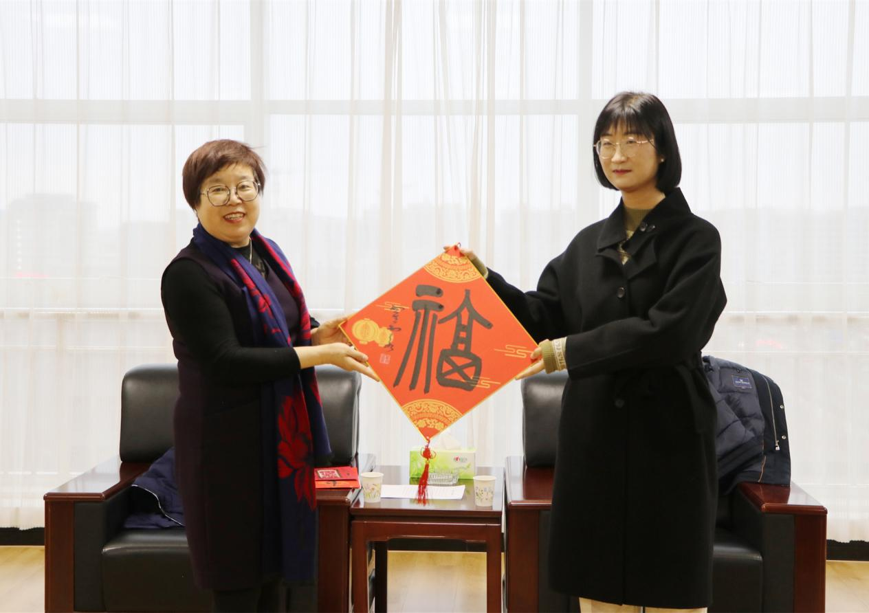 王宏對劉光美一行的到來表示歡迎,并詳細介紹了學校的辦學理念,辦學特色成果,教育改革創(chuàng)新和統(tǒng)戰(zhàn)工作情況等方面內容。劉光美對學校一直以來支持民建組織各項工作表示感謝,并代表民建市委向張葦莉贈送春聯(lián)并致以親切的問候和節(jié)日的祝福,同時勉勵其始終牢記教育初心,爭做師德高尚、潛心育人的好老師。