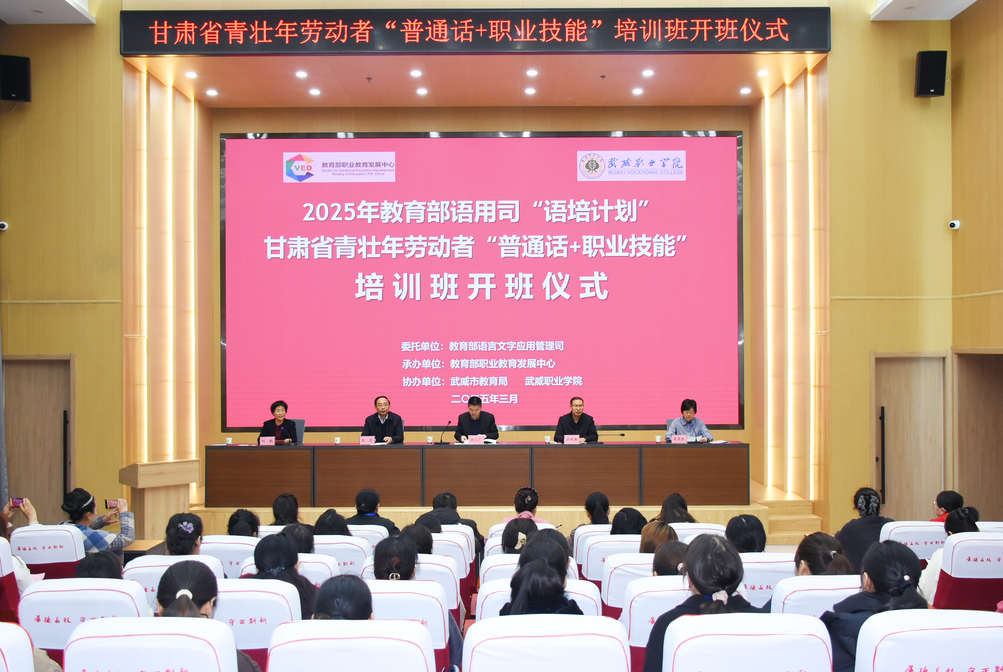 3月25日,教育部語用司“語培計劃”甘肅省青壯年勞動者“普通話+職業(yè)技能”培訓班在學校成功開班。本次培訓由教育部語用司主辦,教育部職業(yè)教育發(fā)展中心承辦,武威市教育局和學校協(xié)辦。本次培訓是深入貫徹落實黨的二十大和二十屆二中、三中全會精神,落實全國教育大會精神,實施《教育強國建設規(guī)劃綱要(2024-2035年)》的重要舉措,旨在進一步推廣國家通用語言文字的應用,促進鑄牢中華民族共同體意識。