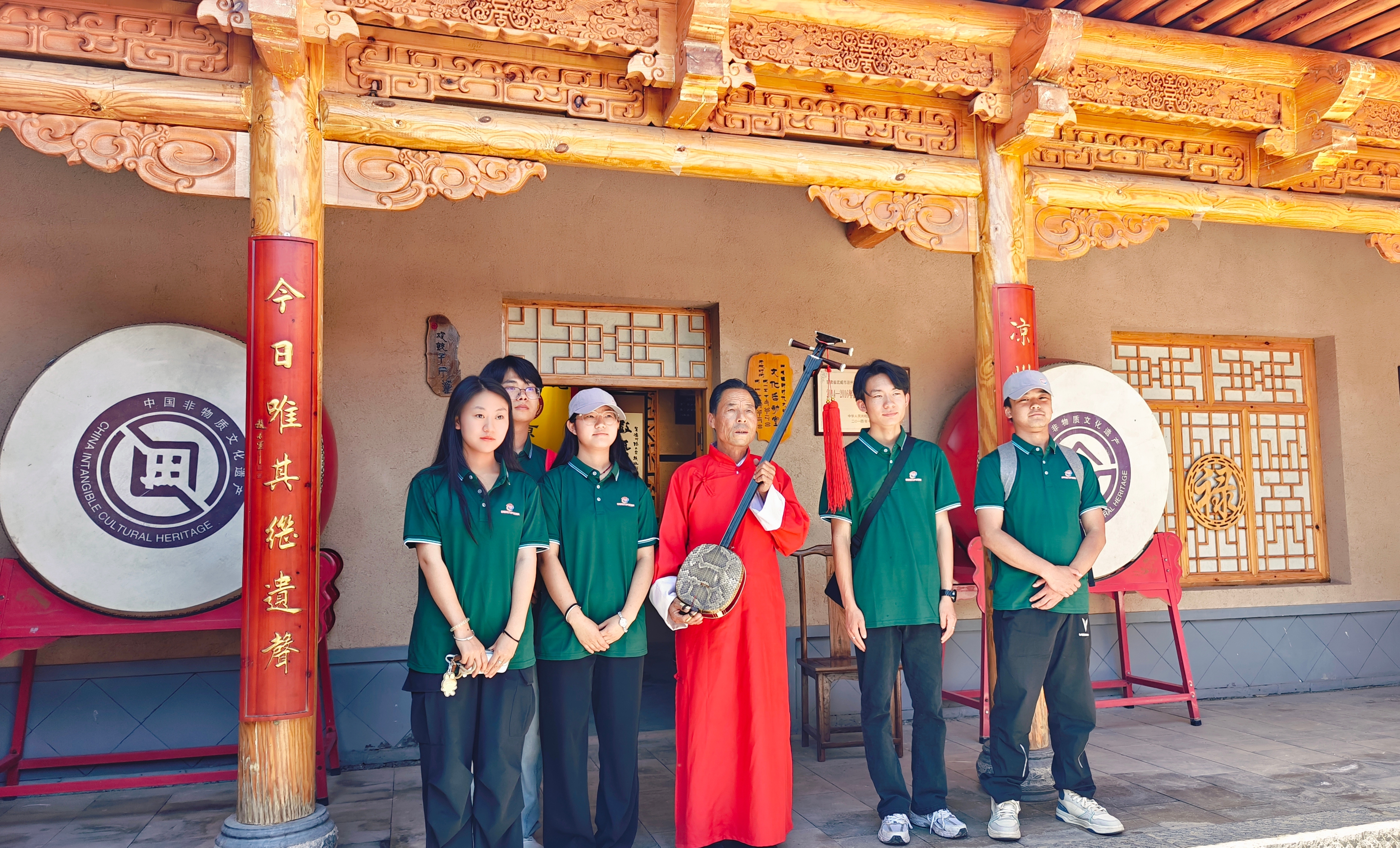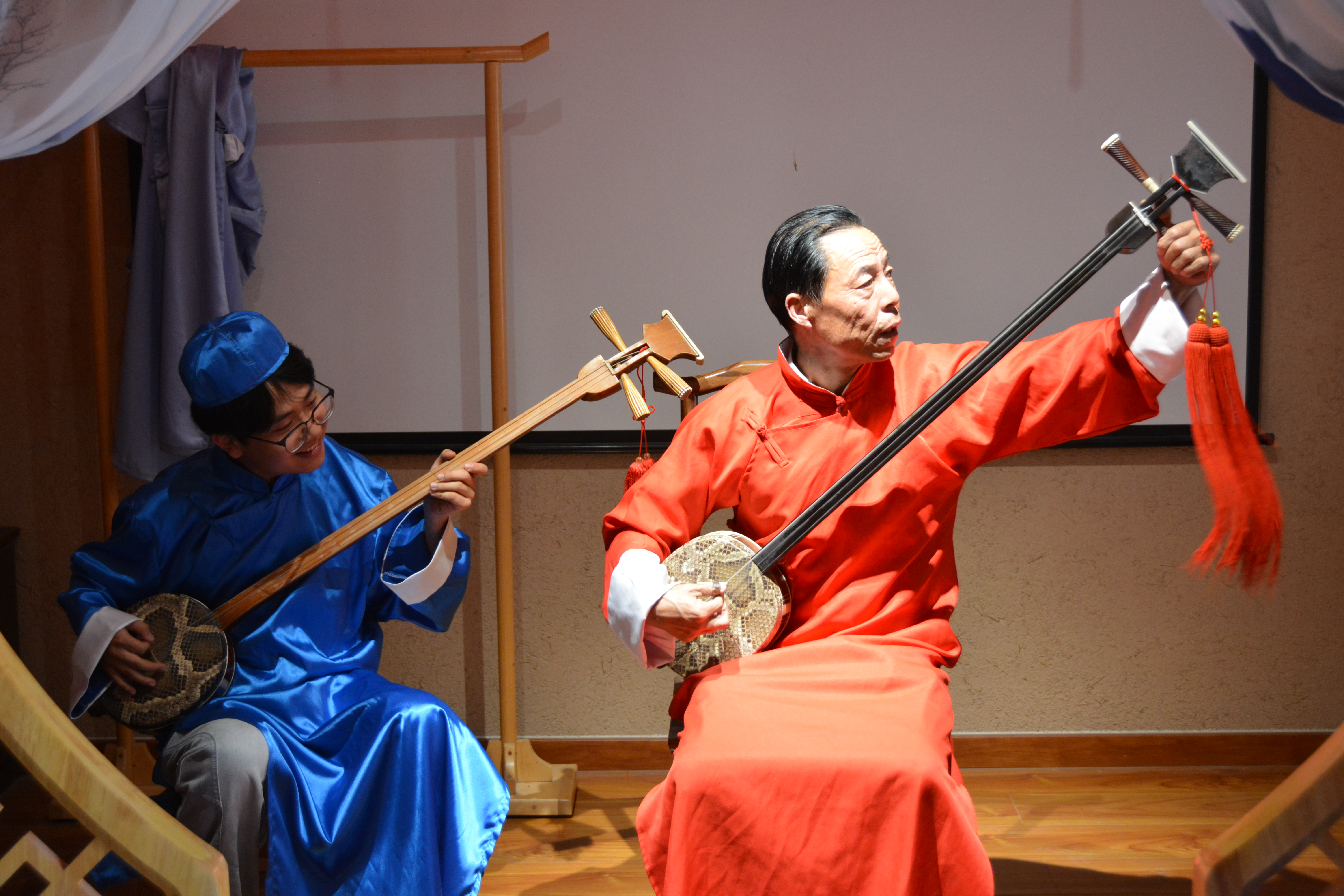非遺民俗文化館當(dāng)天化身成為一座流動的非遺課堂,實踐團(tuán)成員們圍坐在古樸的庭院中,聚精會神地聆聽當(dāng)?shù)刭Y深賢孝藝人董永虎老師深情演繹的經(jīng)典曲目。老藝人蒼勁而富有穿透力的嗓音,伴著三弦琴弦的顫動,將一段段蘊(yùn)含忠孝節(jié)義、勸人向善的古老故事娓娓道來。那飽經(jīng)歲月洗禮的曲調(diào),仿佛穿越時空,在青磚黛瓦間回蕩,讓在場的每一位學(xué)子都深深沉浸其中,體味著這門古老說唱藝術(shù)所承載的歷史重量與人文溫度。