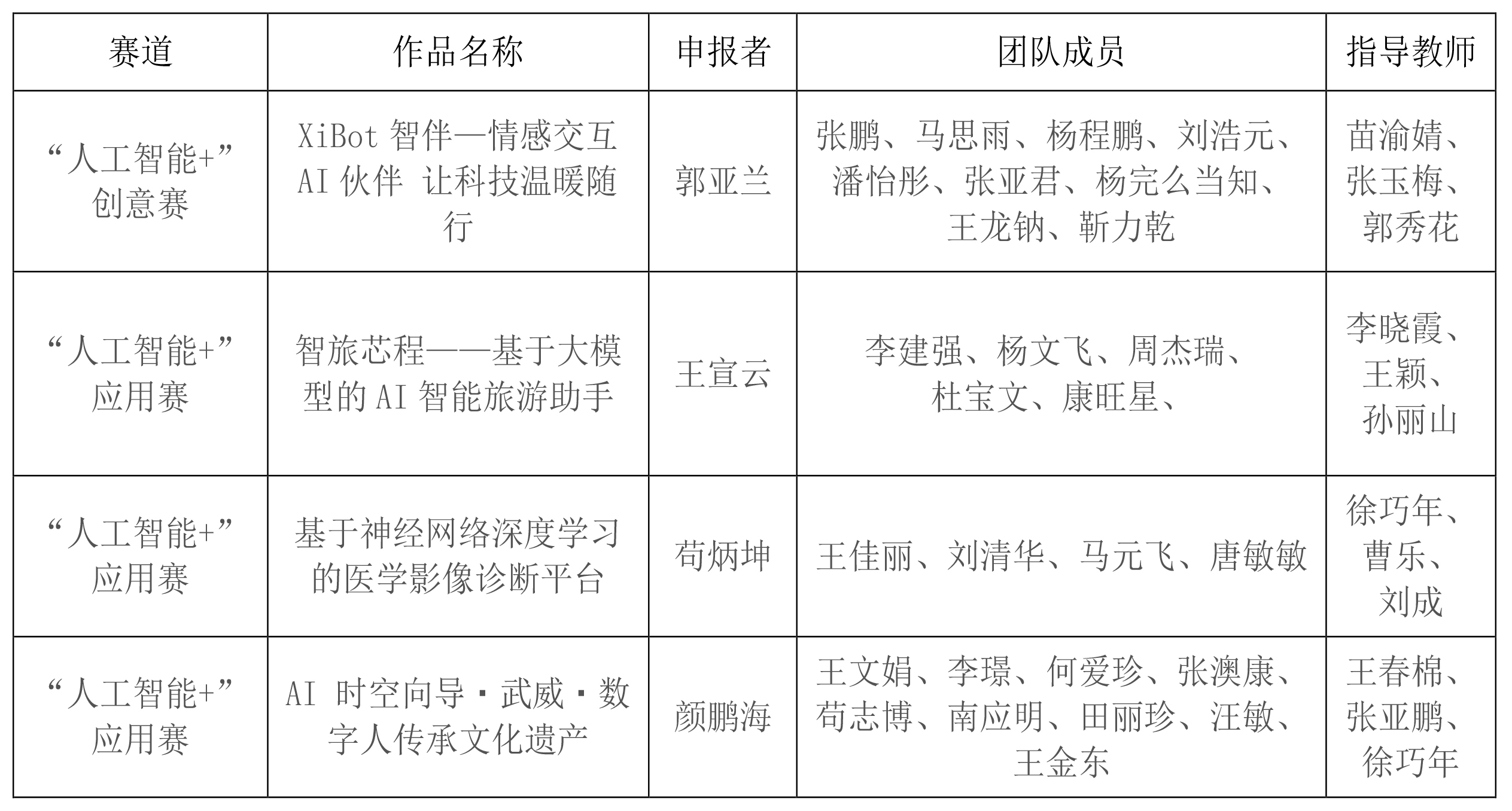 根據(jù)《挑戰(zhàn)杯|第十九屆“挑戰(zhàn)杯”中國移動全國大學生課外學術(shù)科技作品競賽來啦》推文,經(jīng)自主申報,校團委審核,擬推薦以下作品參加第十九屆“挑戰(zhàn)杯”全國大學生課外學術(shù)科技作品競賽“人工智能+”專項賽,現(xiàn)予以公示。