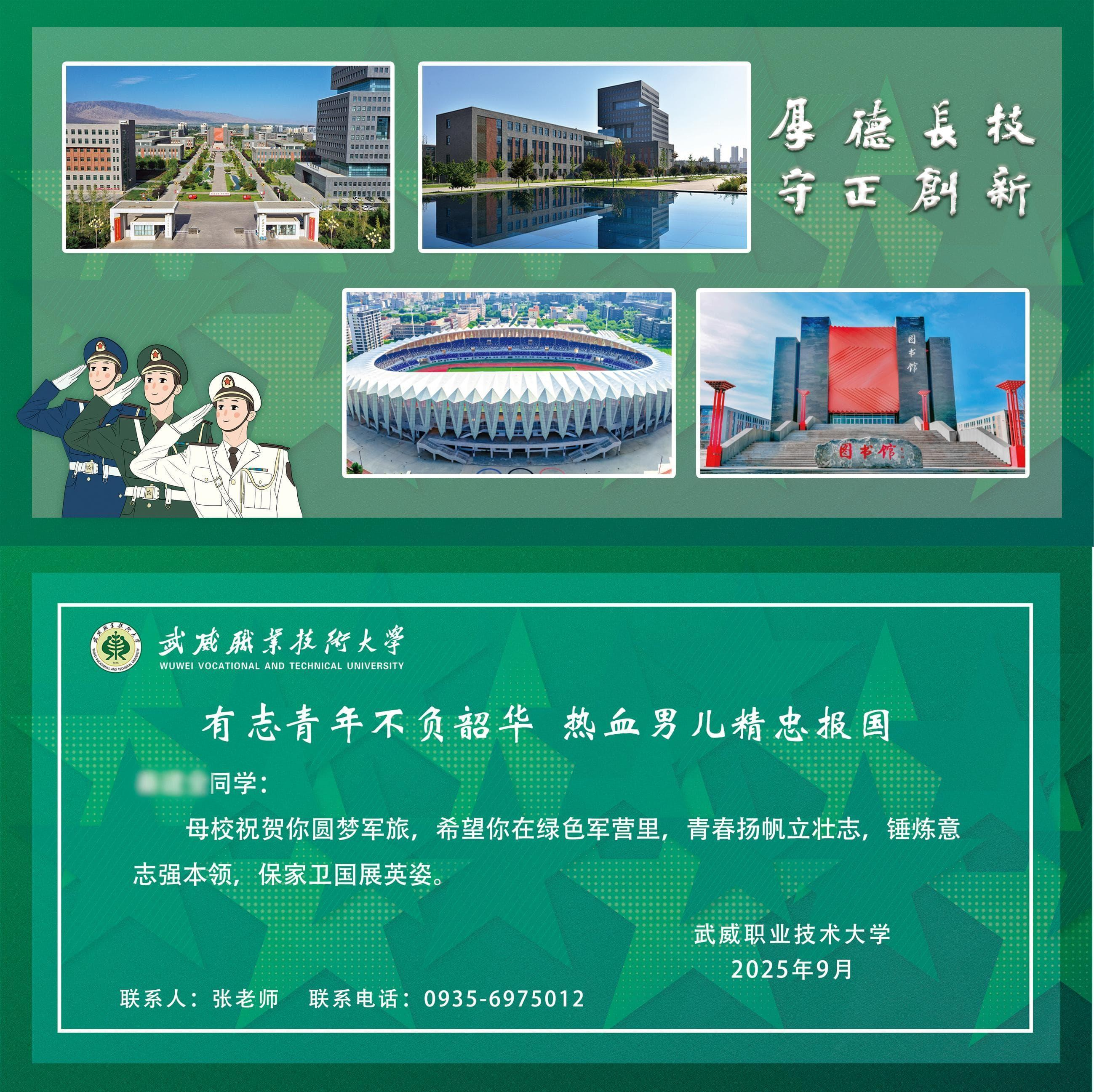 從戎報(bào)國英雄志,建功立業(yè)正當(dāng)時(shí)。經(jīng)歷嚴(yán)謹(jǐn)?shù)捏w檢篩選、政治審查,以及役前集訓(xùn)的磨礪淬煉,武威職業(yè)技術(shù)大學(xué)19名有志青年身披戎裝,即將離開母校進(jìn)入軍營,奔赴國防一線,以青春之名赴山河之約,用熱血擔(dān)當(dāng)書寫保家衛(wèi)國的嶄新篇章。9月15日,學(xué)生工作部(征兵工作站)工作人員和各二級(jí)學(xué)院輔導(dǎo)員、班主任代表前往武威市役前教育訓(xùn)練基地對(duì)參軍學(xué)生進(jìn)行慰問,為他們送行。
