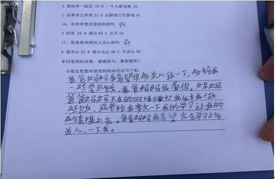 最后志愿者們坐下來相互探討提出建議:父母努力承擔孩子的教育責任。父母雖在外,但是還是應該采取多種方式,多與孩子的溝通交流,以了解孩子的生活、學習、情感變化,比如多用電話聯(lián)系。父母是孩子的第一任老師,因此父母的教育是對孩子影響最大的,因此父母應該多關心孩子,如果不能?;丶遥瑒t應該向孩子的老師說明自己的情況,了解子女的發(fā)展變化,以共同商討教育孩子的策略和方法。同時也要加強關愛留守兒童的各類社會宣傳。充分發(fā)揮各媒體的作用,使更多的人加入到對留守兒童教育問題的研究中來,使各界各類人士共同來探討和研究,從而使留守兒童教育問題得到切實的解決。