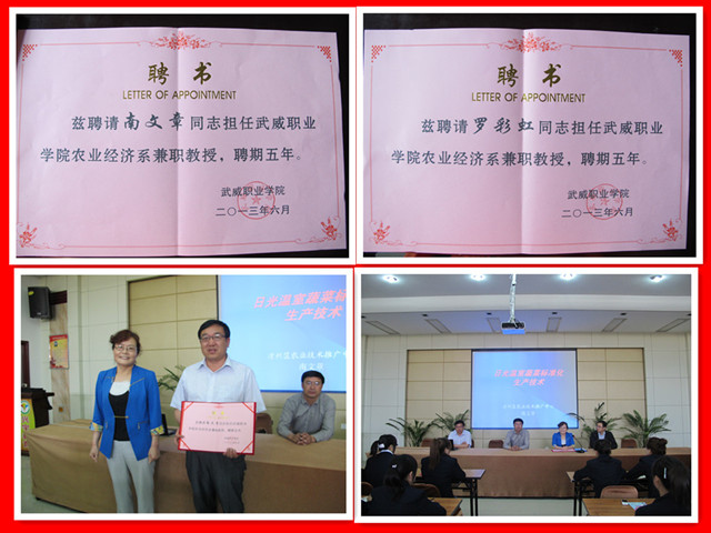 實訓工作開幕式上,農業(yè)經(jīng)濟系聘請武威市涼州區(qū)農技推廣中心高級農藝師南文章和羅彩虹同志為武威職業(yè)學院農業(yè)經(jīng)濟系兼職教授。南文章教授為全體師生做了題為《日光溫室蔬菜標準化生產技術》的專題講座。