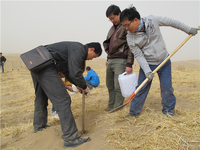 到達治沙造林現(xiàn)場后,師生按照劃分好的區(qū)域,帶上塑料桶,拿上土鉆,馬上投入到了緊張的勞動中。在現(xiàn)場技術(shù)人員的指導(dǎo)下挖坑、栽種樹苗、澆水,完成了預(yù)定的治沙造林任務(wù)。