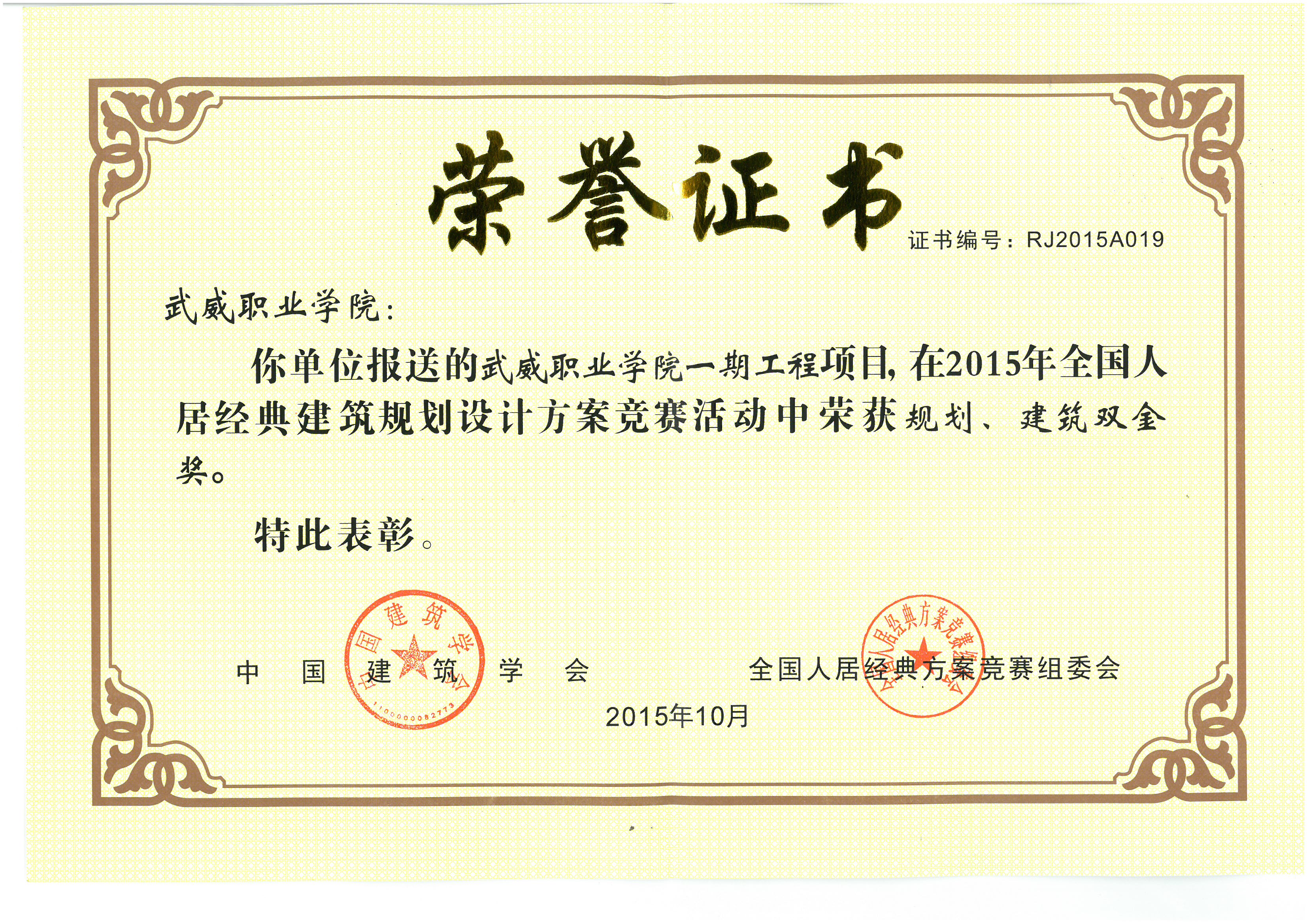 2015年10月,第十五屆全國人居經(jīng)典建筑規(guī)劃設(shè)計(jì)方案競賽結(jié)果在北京揭曉,我院報(bào)送的武威職業(yè)學(xué)院一期擴(kuò)建項(xiàng)目在全國眾多參賽項(xiàng)目中脫穎而出,榮膺規(guī)劃、建筑雙金獎(jiǎng)。全國人居經(jīng)典方案競賽由中國建筑學(xué)會主辦,全國人居經(jīng)典方案競賽組委會承辦,自2001年起每年舉辦一屆,參賽項(xiàng)目覆蓋全國所有省份及港澳臺地區(qū),評審專家皆為業(yè)界權(quán)威,獲獎(jiǎng)難度大,權(quán)威性高。榮膺規(guī)劃、建筑雙金獎(jiǎng)是武威建筑項(xiàng)目上的首次。
