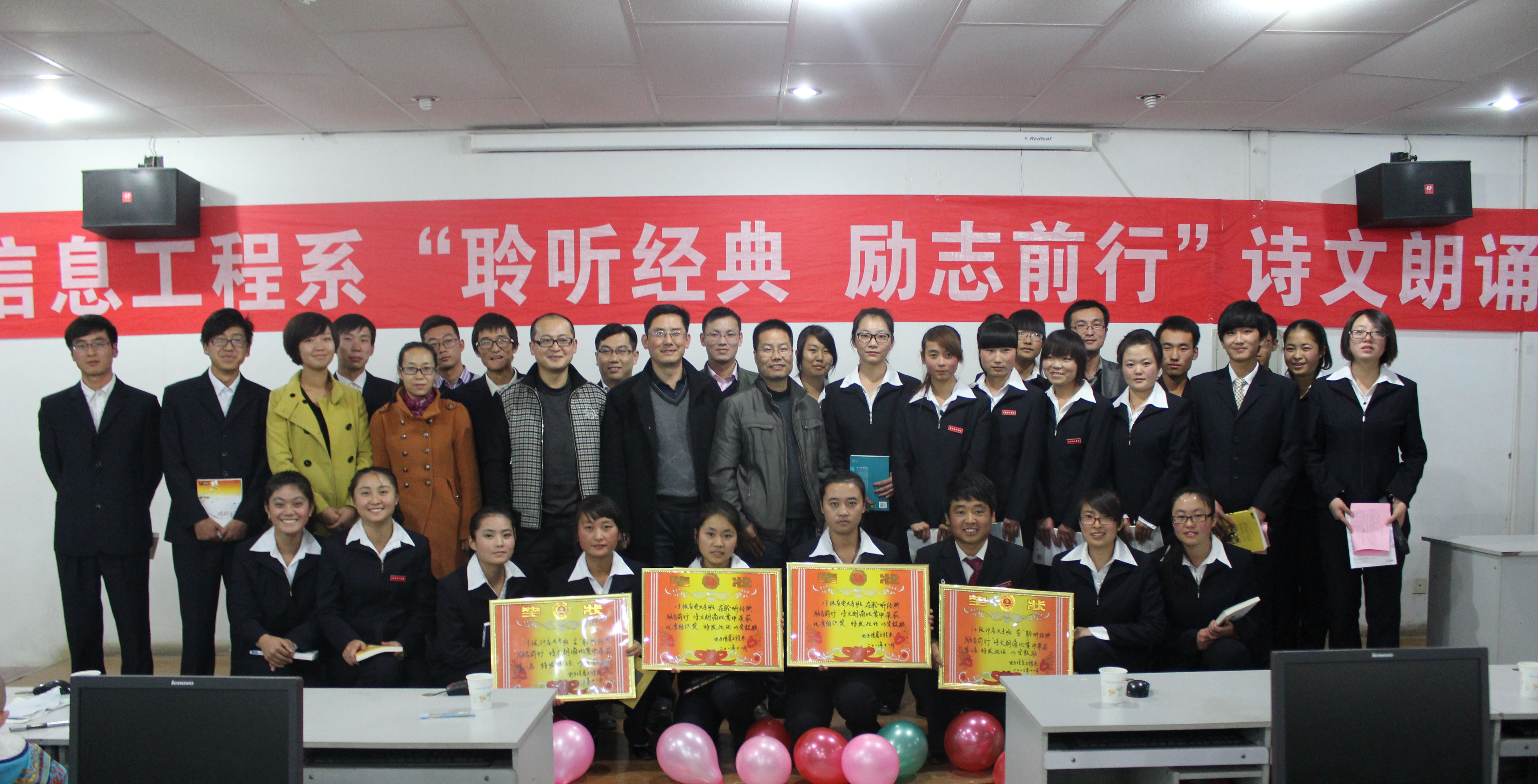 11月14日晚,電子信息工程系團總支舉辦“聆聽經(jīng)典•勵志前行”詩文朗誦比賽,在一號教學樓十號機房進行。黨總支書記張伯成,輔導員鄧偉華、唐宗舜,全體班主任及180多名學生觀看了比賽。