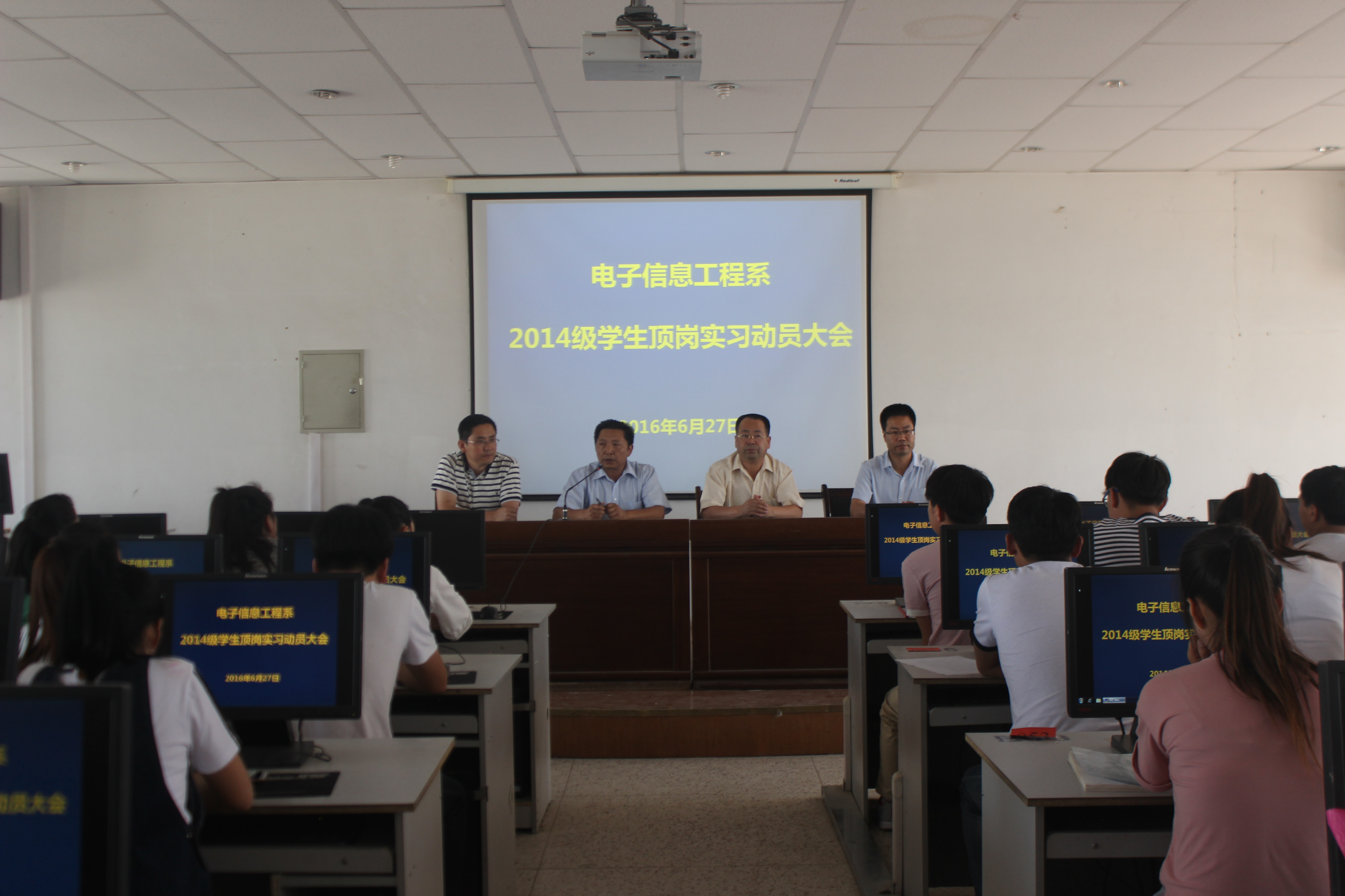 2016年6月27日下午3點,電子信息工程系2014級學(xué)生頂崗實習(xí)動員大會在尚德樓十一號機(jī)房舉行。系黨總支書記袁青年、系主任白玉珍、副書記張伯成,班主任鄧偉華、唐宗舜、孫麗山、陳平及2014級全體學(xué)生參加頂崗實習(xí)動員大會。