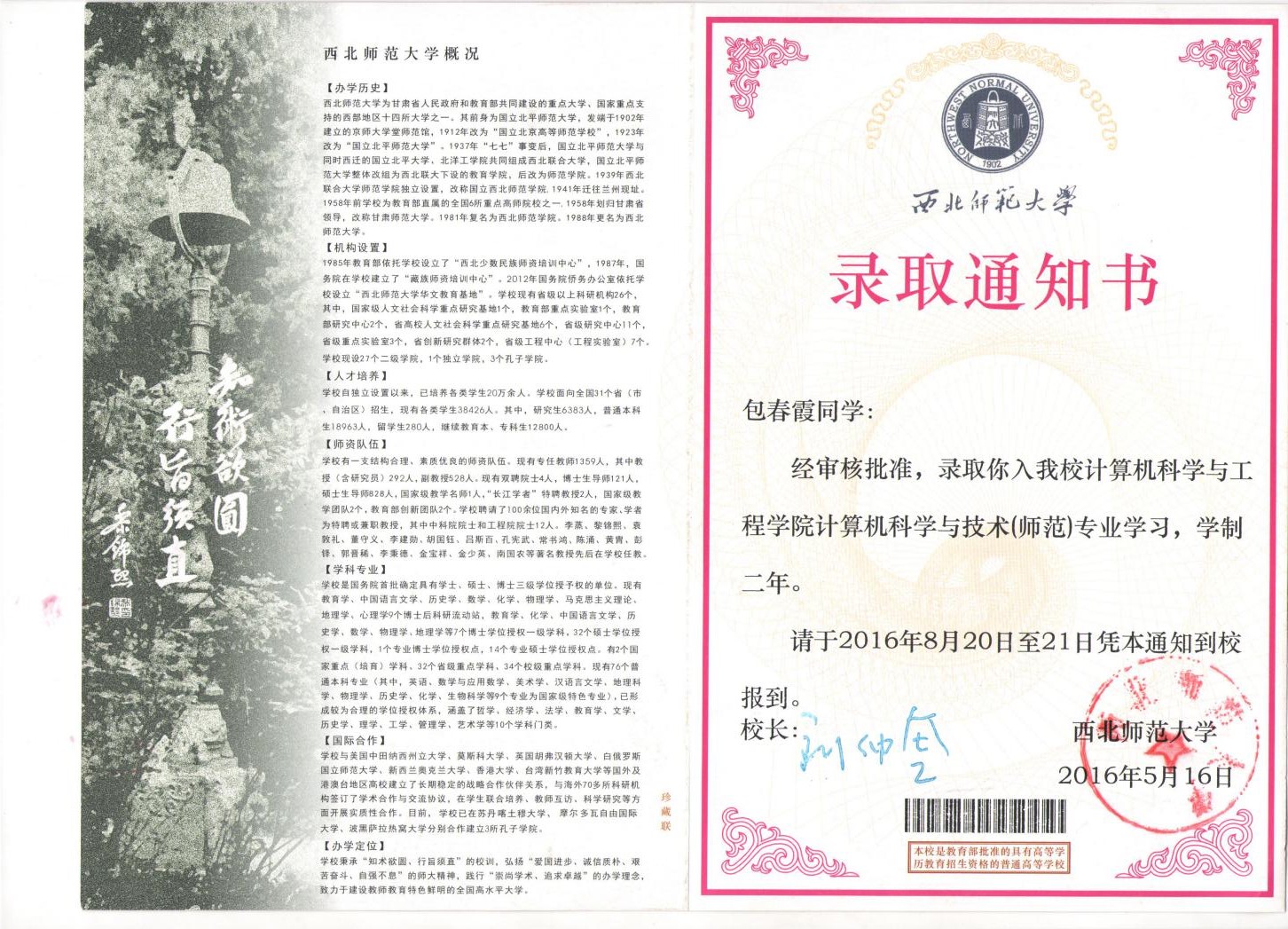 近日傳來喜訊,我系13級計算機應(yīng)用大專班包春霞同學(xué)在2016年甘肅省專升本考試中,被西北師范大學(xué)計算機科學(xué)與工程學(xué)院錄取。