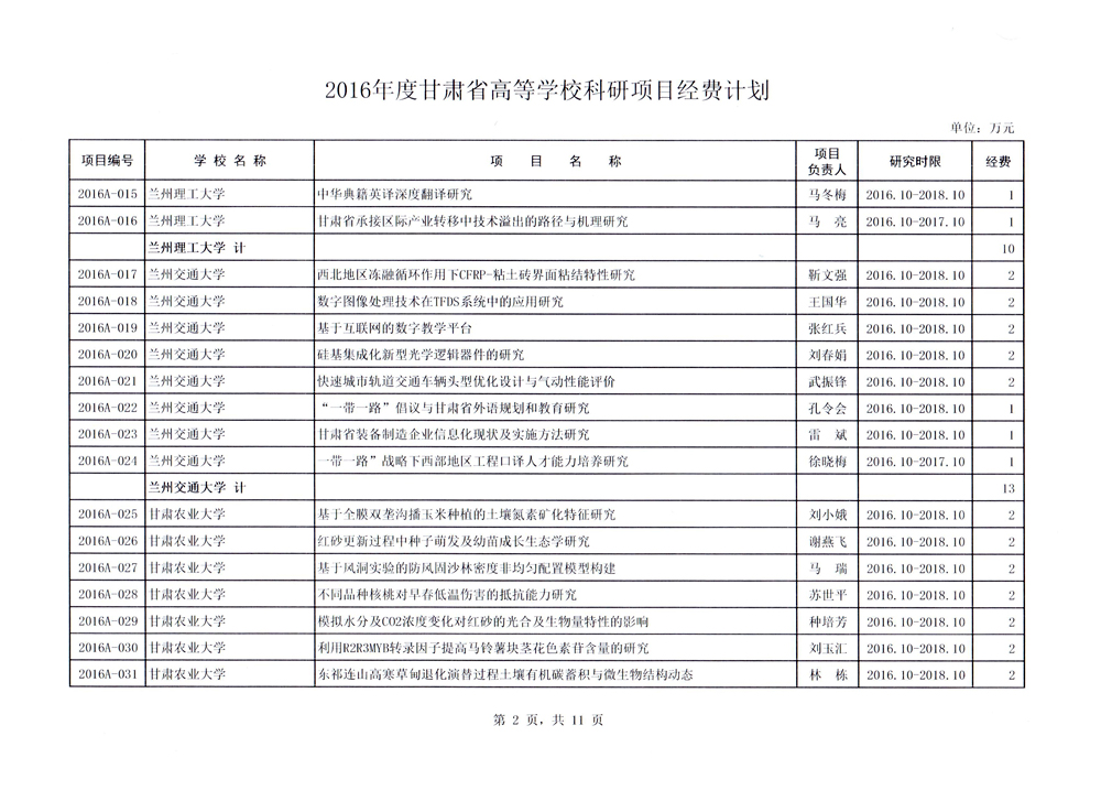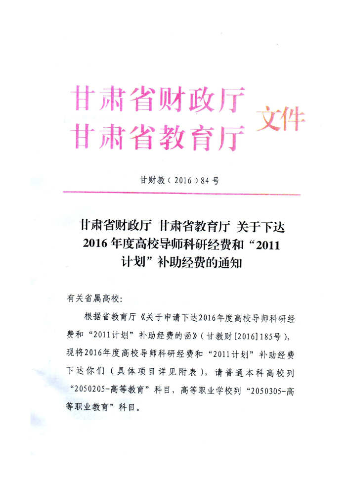 甘肅省教育廳關(guān)于下達2016年度甘肅省高等學(xué)??蒲许椖孔曰I經(jīng)費項目的通知
