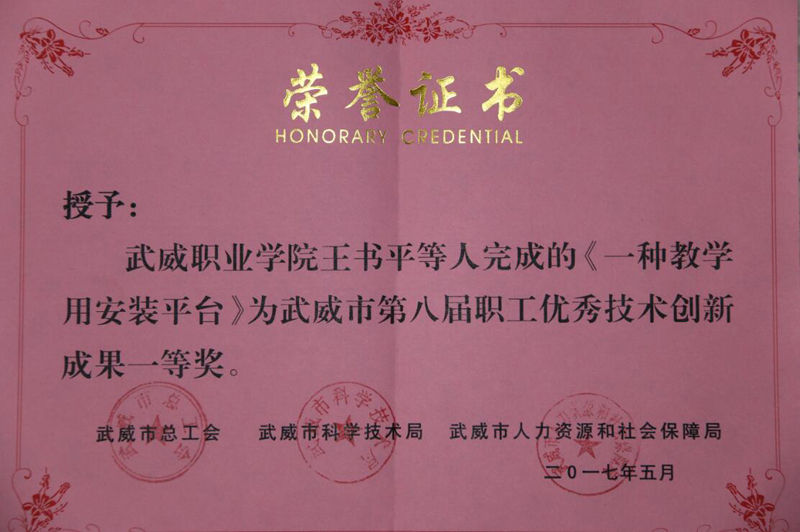 為貫徹落實(shí)武威市委、市政府關(guān)于《武威市十萬職工職業(yè)技能素質(zhì)提升活動(dòng)工作方案(2016-2020年)》(武政辦發(fā)〔2016〕72號(hào))文件精神,推動(dòng)我市“雙創(chuàng)”工作的深入開展,激發(fā)我市廣大企事業(yè)職工提升技能和開拓創(chuàng)新的熱情。近日,由市總工會(huì)、市人社局、市科技局等單位聯(lián)合舉辦了“武威市第八屆職工技術(shù)創(chuàng)新成果評(píng)選活動(dòng)”。本屆職工技術(shù)創(chuàng)新成果評(píng)選共征集創(chuàng)新成果87項(xiàng),其中:學(xué)院推薦了十項(xiàng)研究課題、專利技術(shù)項(xiàng)目,王書平團(tuán)隊(duì)《一種教學(xué)用安裝平臺(tái)》項(xiàng)目成果榮獲一等獎(jiǎng),申賓德團(tuán)隊(duì)《簡(jiǎn)易焊工考試用帶坡口鋼板火焰切割下料機(jī)的研究與應(yīng)用》,王勝團(tuán)隊(duì)《“胰美舒”治療2型糖尿病周圍神經(jīng)病變(氣陰兩虛兼瘀證)的臨床觀察》項(xiàng)目成果榮獲三等獎(jiǎng)。