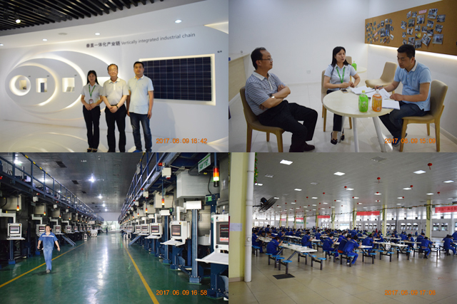 晶科能源控股有限公司是全球?yàn)閿?shù)不多的擁有垂直一體化產(chǎn)業(yè)鏈的光伏制造企業(yè),業(yè)務(wù)涵蓋了優(yōu)質(zhì)的硅錠、硅片、電池片生產(chǎn)、高效單多晶光伏組件制造以及光伏電站建設(shè)等領(lǐng)域,是目前全球光伏組件生產(chǎn)的龍頭企業(yè),2016年中國(guó)500強(qiáng)企業(yè)。公司負(fù)責(zé)人帶領(lǐng)考察人員參觀了公司現(xiàn)代化的生產(chǎn)車間、晶科商學(xué)院、員工宿舍和食堂,介紹了公司的發(fā)展情況和用人需求。在考察過(guò)程中,考察人員就公司給學(xué)生提供的工作崗位、待遇、住宿、安全管理等情況與企業(yè)負(fù)責(zé)人進(jìn)行了深入交流。