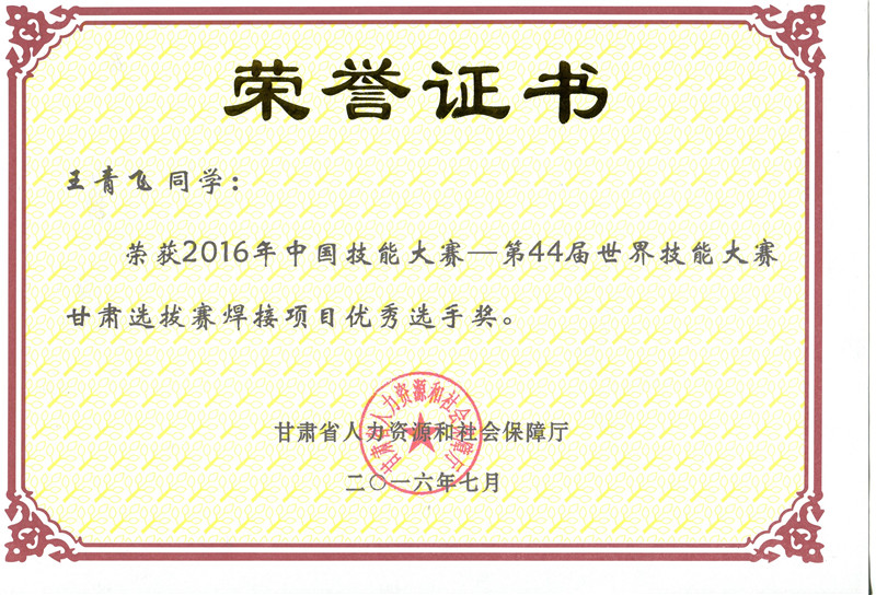 第44屆世界技能大賽甘肅選拔賽焊接項目優(yōu)秀獎