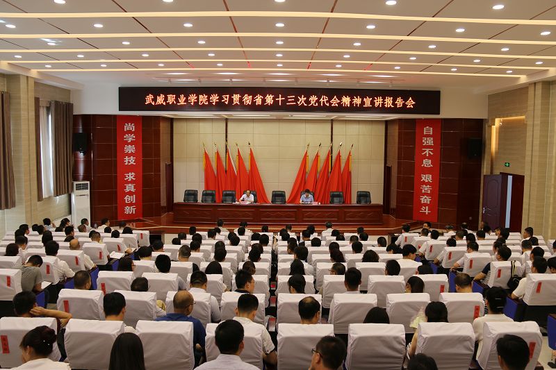 張國民強調(diào),學(xué)院要把學(xué)習(xí)好、宣傳好、貫徹落實好省第十三次黨代會精神作為當(dāng)前首要的政治任務(wù)。廣大黨員和干部師生要努力提高政治站位,切實把思想和行動統(tǒng)一到省第十三次黨代會的決策部署上來,把黨代會精神轉(zhuǎn)化為推動學(xué)院改革發(fā)展的強大動力;學(xué)院各級黨組織要以此次宣講為契機,在前一階段學(xué)習(xí)的基礎(chǔ)上,繼續(xù)通過集中學(xué)習(xí)、集中輪訓(xùn)、集體研討、舉辦報告會等多種形式, 開展深入系統(tǒng)的學(xué)習(xí)研討,營造學(xué)習(xí)宣傳貫徹黨代會精神的濃厚氛圍;要把學(xué)習(xí)貫徹省第十三次黨代會精神與學(xué)習(xí)貫徹習(xí)近平總書記系列重要講話精神、黨的十八屆六中全會精神、全國高校思想政治工作會議精神和即將召開的黨的十九大精神緊密結(jié)合起來,統(tǒng)籌謀劃,同步推進(jìn);要把學(xué)習(xí)宣傳貫徹省第十三次黨代會精神與學(xué)院“兩學(xué)一做”學(xué)習(xí)教育常態(tài)化制度化、“三比兩促”主題活動、貫徹落實學(xué)院第一次黨代會精神、學(xué)院“十三五”發(fā)展規(guī)劃、創(chuàng)建甘肅省優(yōu)質(zhì)高等職業(yè)院校和實現(xiàn)一流高職院校發(fā)展目標(biāo)緊密結(jié)合起來,靠實工作責(zé)任,真抓實干,使學(xué)院在辦學(xué)質(zhì)量、產(chǎn)教融合、招生就業(yè)、服務(wù)社會等方面全面提升,為全省教育精準(zhǔn)扶貧和建設(shè)幸福美好新甘肅貢獻(xiàn)智慧和力量,以優(yōu)異的成績迎接黨的十九大勝利召開。