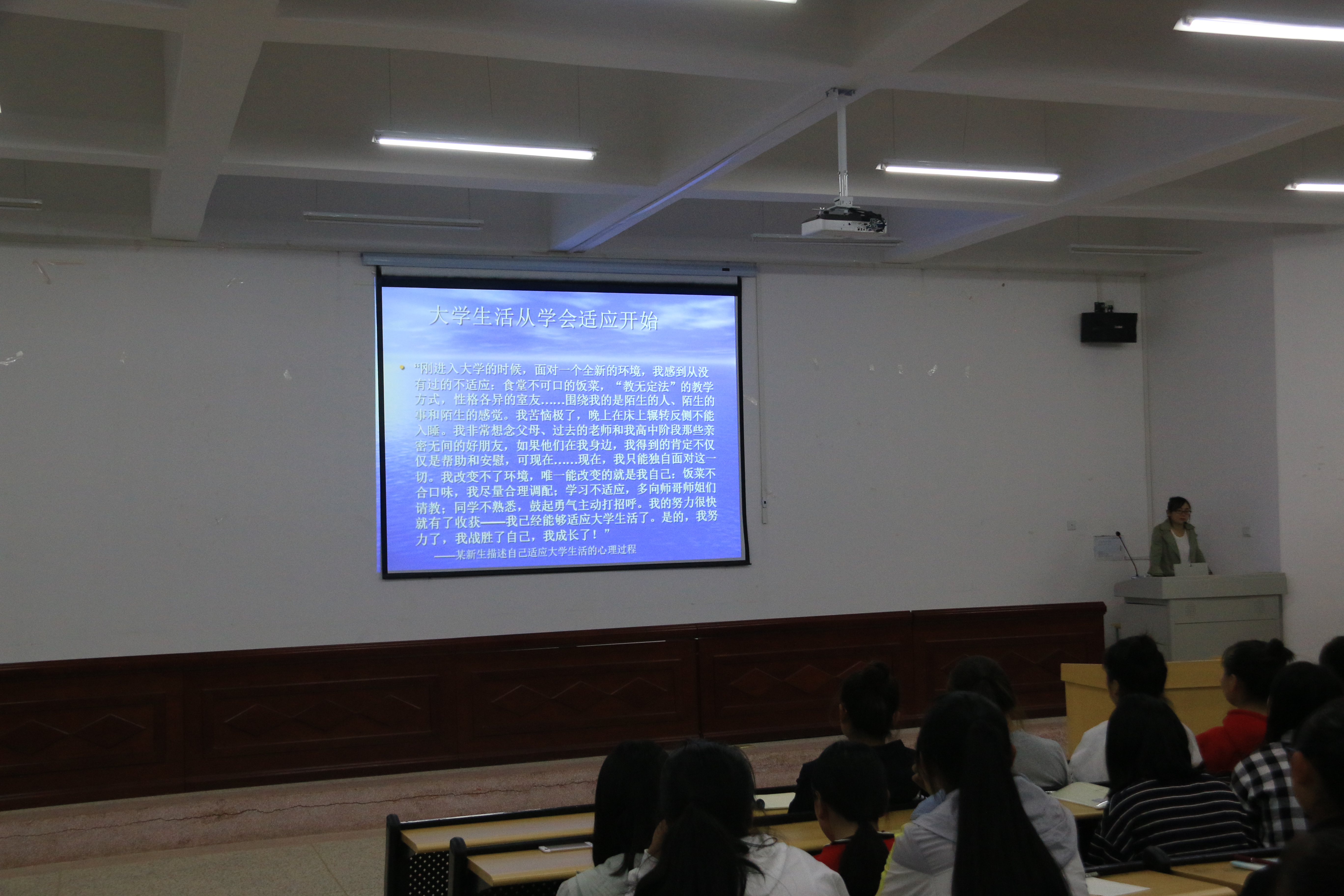 此次講座,幫助大一新生正確認(rèn)識自我,積極應(yīng)對挫折,樹立樂觀上進的心態(tài),建立良好的人際關(guān)系,消除新生對大學(xué)生活的種種疑惑,對他們的心理健康教育是十分必要和及時的。