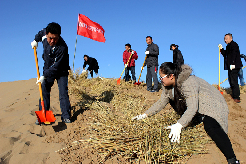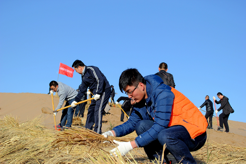 ?11月7日,按照市委市政府統(tǒng)一安排,直屬附屬醫(yī)院干部職工共計(jì)30余人前往涼州區(qū)榮生路南側(cè)八十里大沙頭道槽參加義務(wù)壓沙治沙勞動(dòng)。在黃沙茫茫的大沙漠上,鮮紅色的醫(yī)院院旗迎風(fēng)招展,醫(yī)院干部職工在沙丘上揮鍬開溝、鋪稻草、培沙土、草方格逐漸覆蓋了一個(gè)個(gè)沙丘,沙丘上的草方格在陽光下金光閃閃……