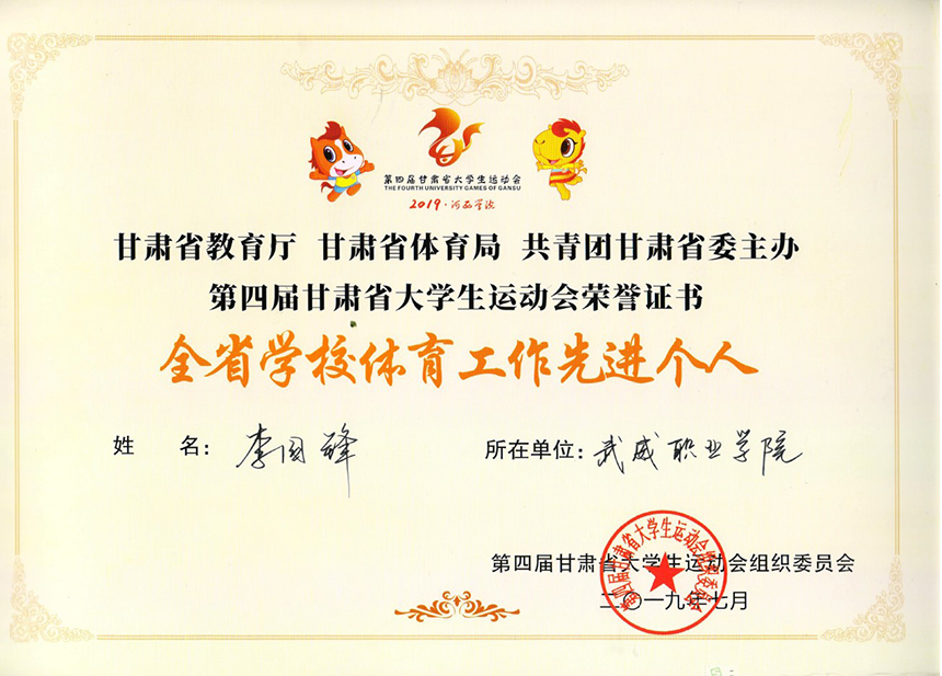 甘肅省教育廳甘肅省體育局共青團甘肅省委主辦第四屆甘肅省大學(xué)生運動會被評為“全省學(xué)校體育工作先進個人”