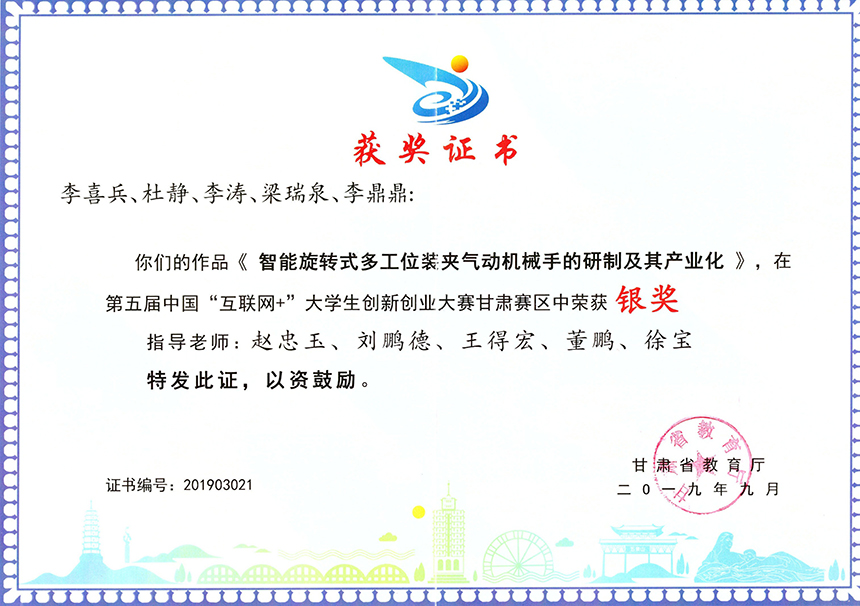 第五屆中國“互聯(lián)網(wǎng)+”大學(xué)生創(chuàng)新創(chuàng)業(yè)大賽甘肅賽區(qū)《智能旋轉(zhuǎn)式多工位裝夾氣動機(jī)械手的研制及其產(chǎn)業(yè)化》