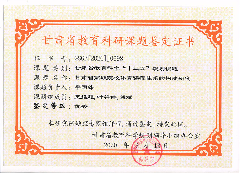 6.2020年項(xiàng)目組成員李國(guó)鋒完成甘肅省教育科學(xué)“十三五”規(guī)劃課題《甘肅省高職院校體育課程體系的構(gòu)建研究》已結(jié)項(xiàng)獲優(yōu)秀獎(jiǎng) 【鑒定證書】