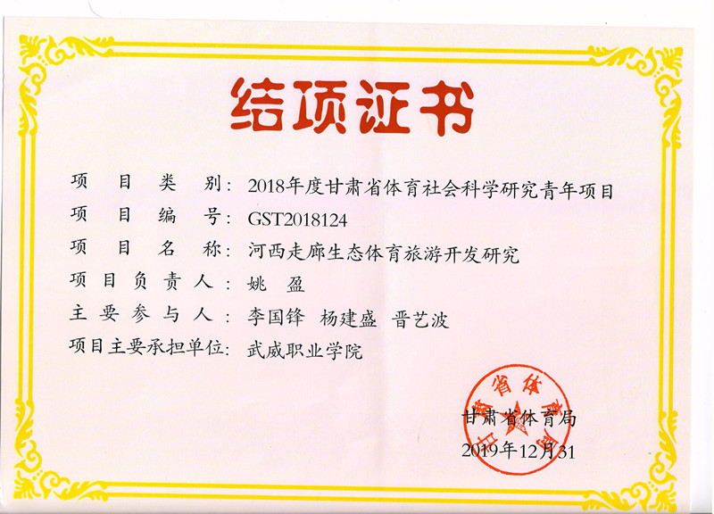 8.2019年項(xiàng)目組成員李國(guó)鋒參與完成甘肅省體育社會(huì)科學(xué)研究青年項(xiàng)目《河西走廊生態(tài)體育旅游開發(fā)研究》已結(jié)項(xiàng) 【結(jié)項(xiàng)證書】