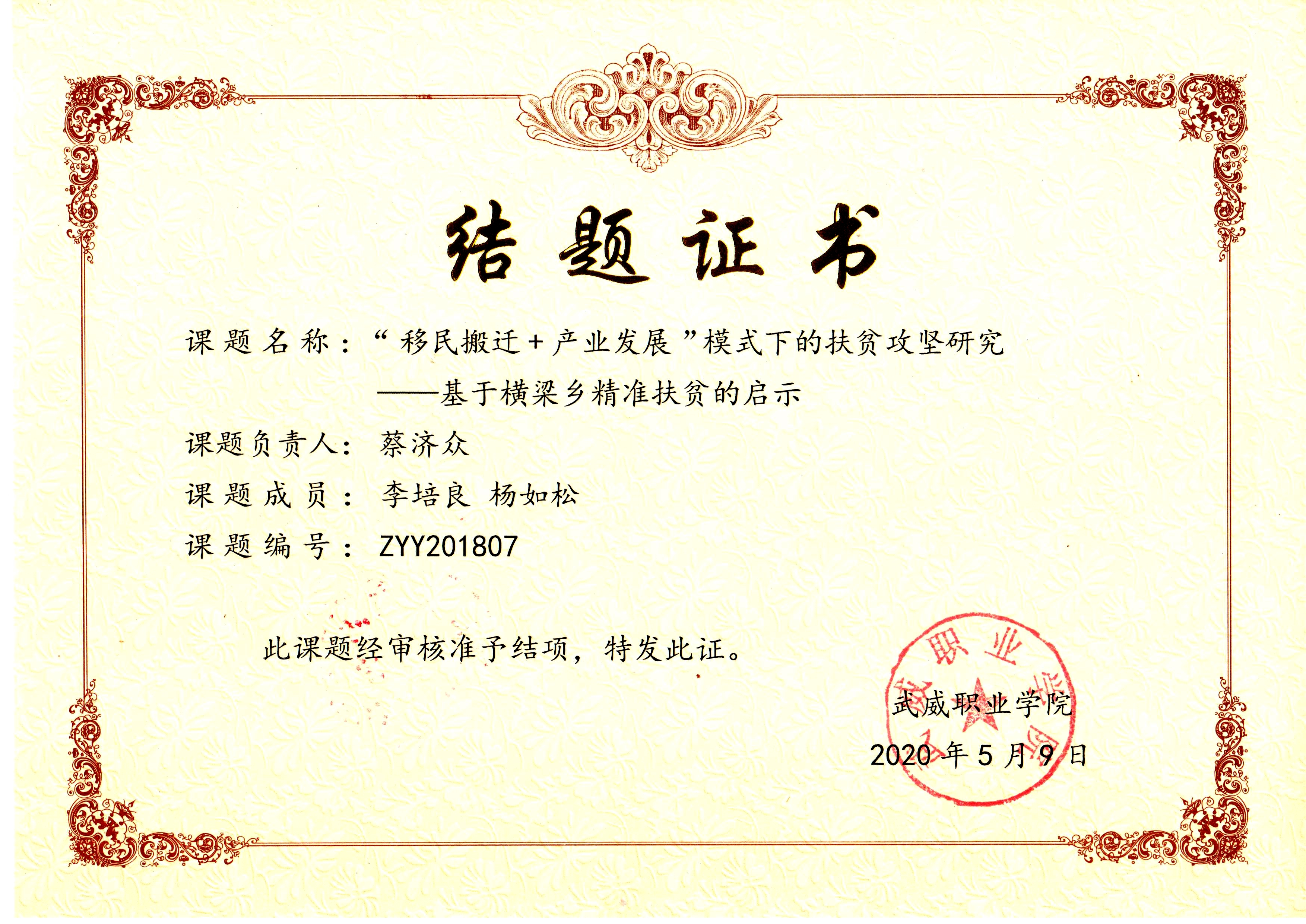 25.2020年項(xiàng)目組成員蔡濟(jì)眾主持完成院級(jí)科研項(xiàng)目《“移民搬遷+產(chǎn)業(yè)發(fā)展”模式下的扶貧攻堅(jiān)研究--基于橫梁鄉(xiāng)精準(zhǔn)扶貧的啟示》 結(jié)項(xiàng) 【結(jié)題證書】