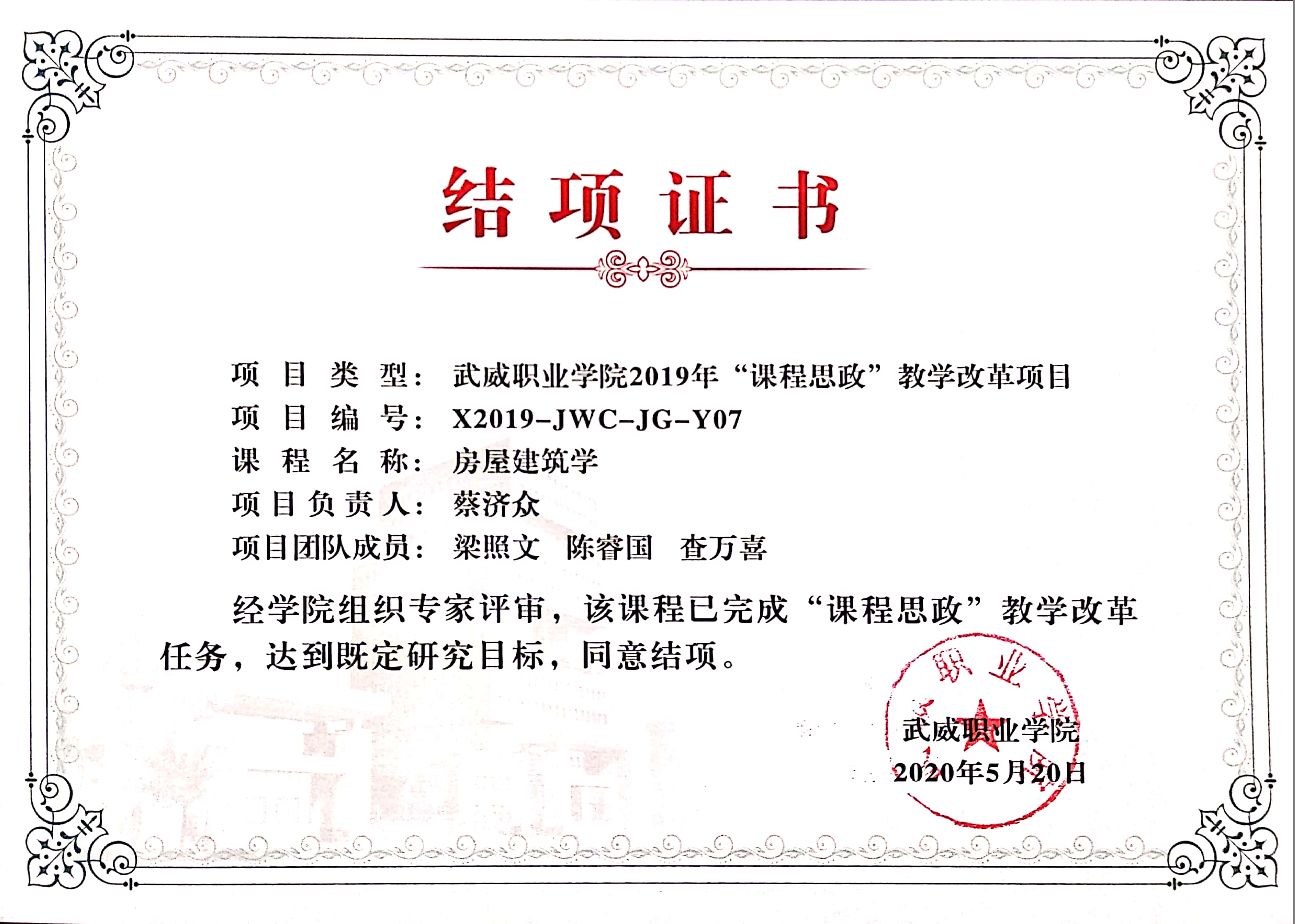 26.2020年項(xiàng)目組成員蔡濟(jì)眾、陳睿國(guó)主持完成《房屋建筑學(xué)》課程思政改革? 結(jié)項(xiàng) 【結(jié)項(xiàng)證書】