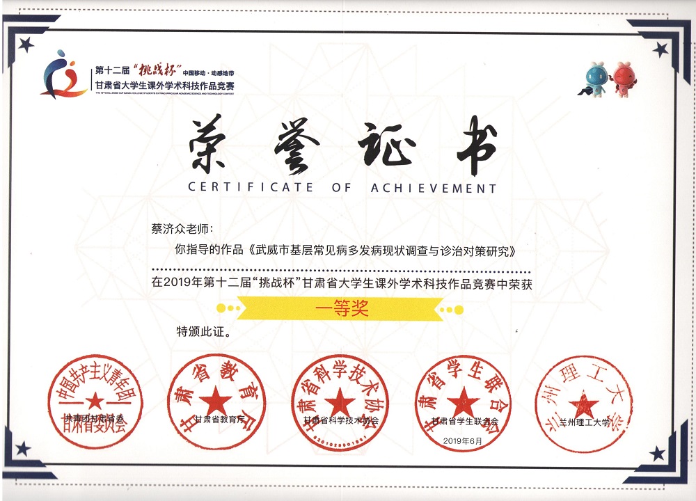 第十二屆“挑戰(zhàn)杯”甘肅省大學生課外學術科學作品《武威市基層常見病多發(fā)病現(xiàn)狀調查與診治對策研究》