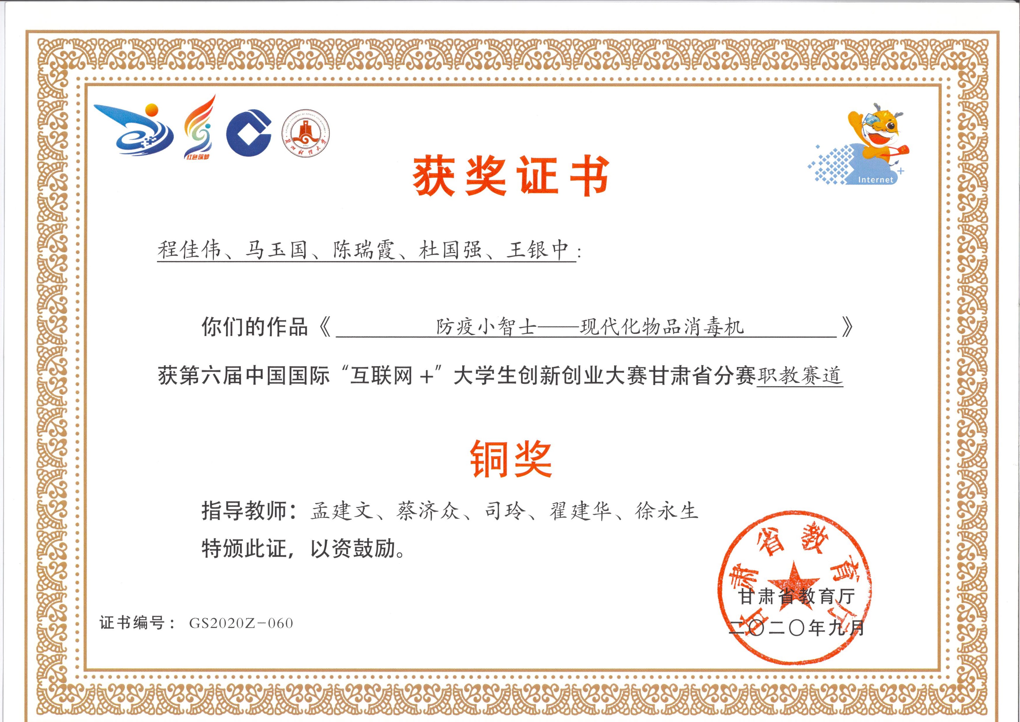 第六屆中國國際“互聯(lián)網(wǎng)+”大學生創(chuàng)新創(chuàng)業(yè)大賽甘肅省分賽職教賽道《防疫小智士—現(xiàn)代化物品消毒機》
