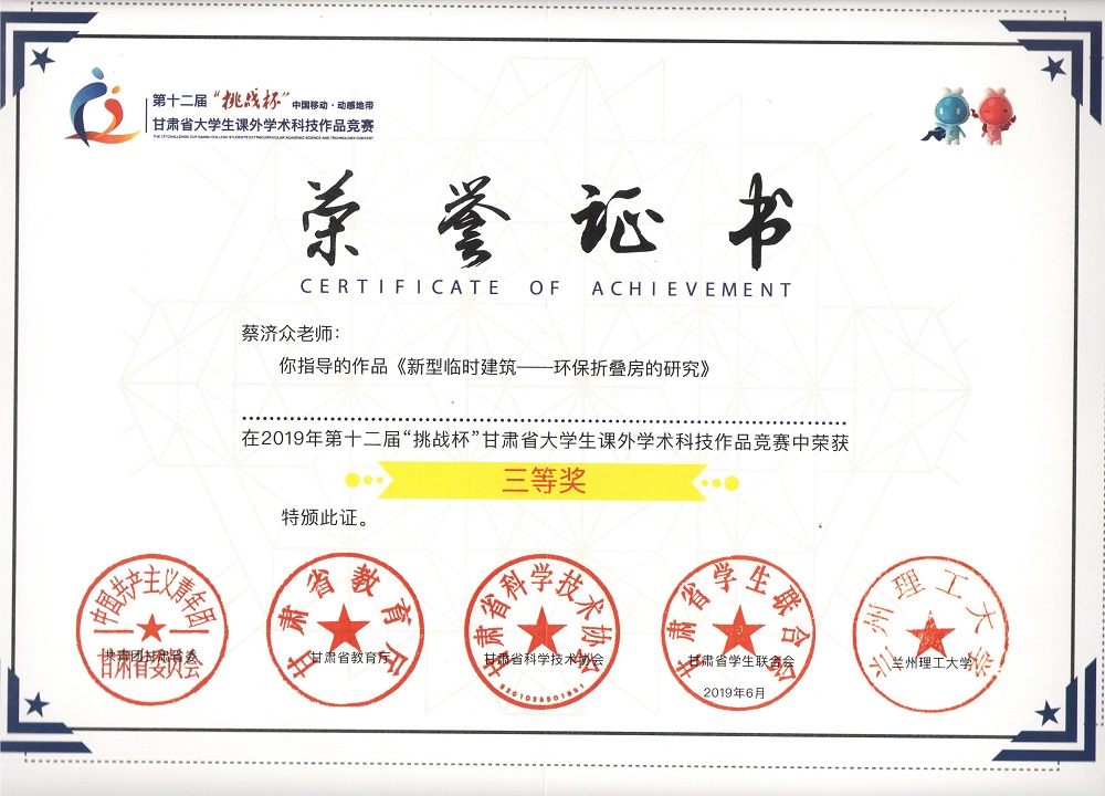第十二屆“挑戰(zhàn)杯”甘肅省大學生課外學術科學作品《新型臨時建筑—環(huán)保折疊房的研究》