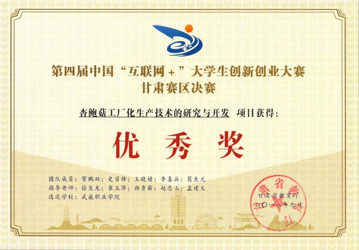 第四屆中國“互聯(lián)網(wǎng)+”大學生創(chuàng)新創(chuàng)業(yè)大賽甘肅賽區(qū)決賽《杏鮑菇工廠化生產(chǎn)技術的研究與開發(fā)》