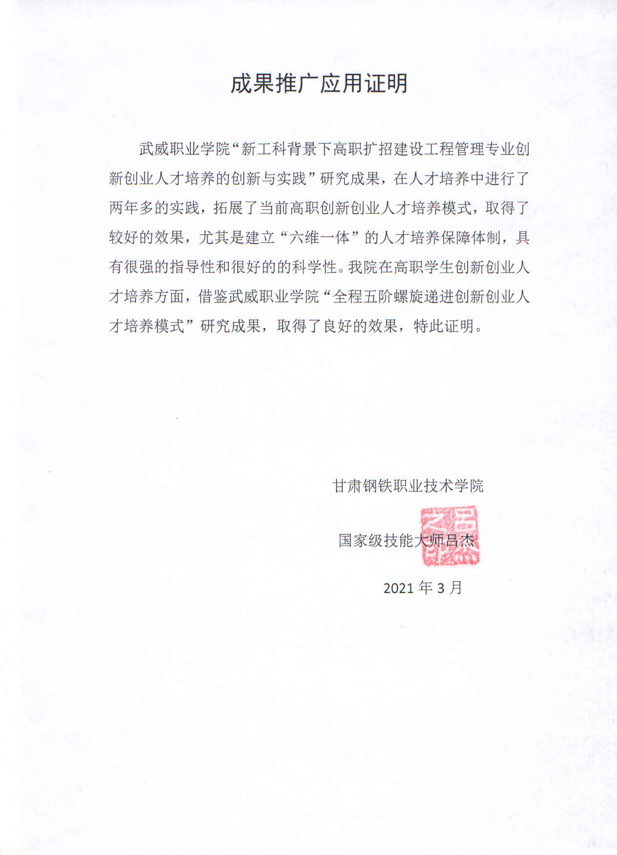 成果推廣應(yīng)用證明(甘肅鋼鐵職業(yè)技術(shù)學(xué)院、國(guó)家級(jí)技能大師呂杰)
